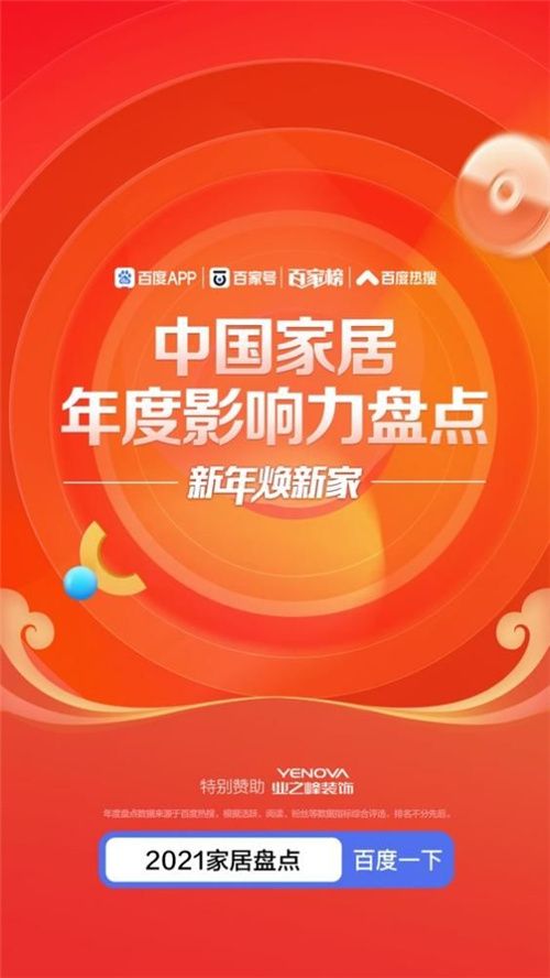 为了更好服务家居行业,提升百度APP及百家号在行业的影响力,加强家居创作者、设计师及B端品牌等行业参与者对百度家居内容营销的心智建设,百家号发起【中国家居年度影响力盘点】。项目1月20号在百度APP正式上线。项目由百家号百家榜、百度热搜提供专业数据支持,业之峰装饰特别赞助。(百度搜索「2021家居盘点」即可进入主会场。)