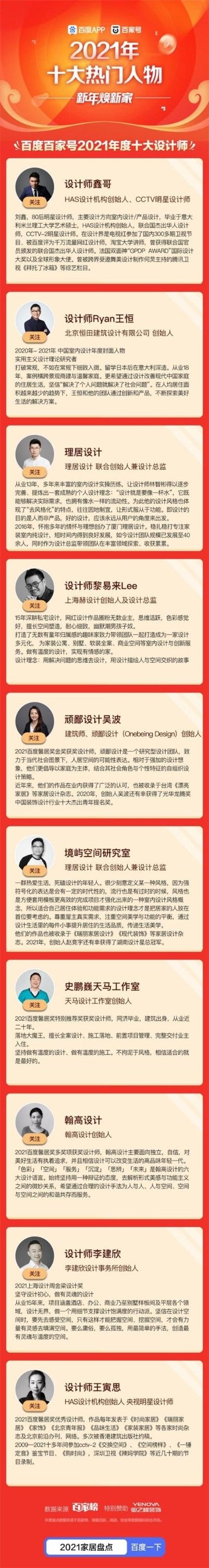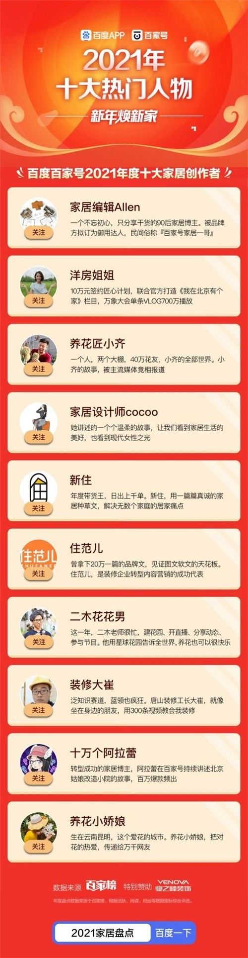 盘点百度平台家居行业年度影响力人物。从百家号内容量、阅读量、互动率、粉丝量等多个维度综合考量,选出年度十大家居创作者、十大设计师。他们是百家号内容的中坚力量。