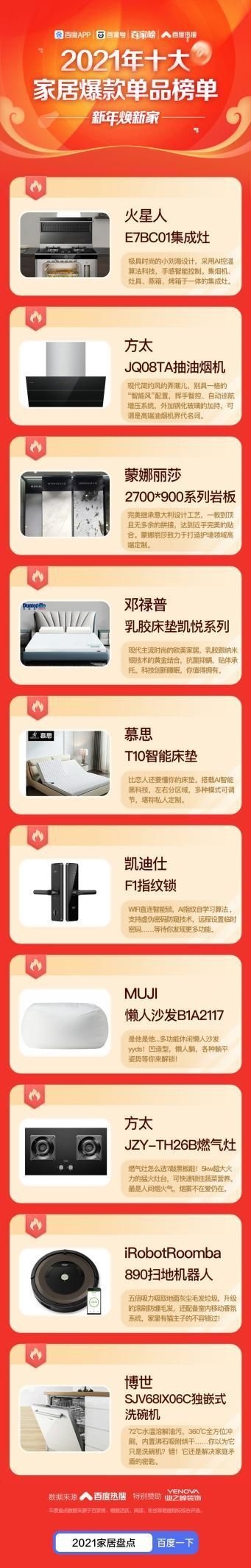 根据百度站内家居单品数据和百家号百人评选团票选结果两方数据源评出年度爆款单品。他们是21年最受欢迎的家居单品。