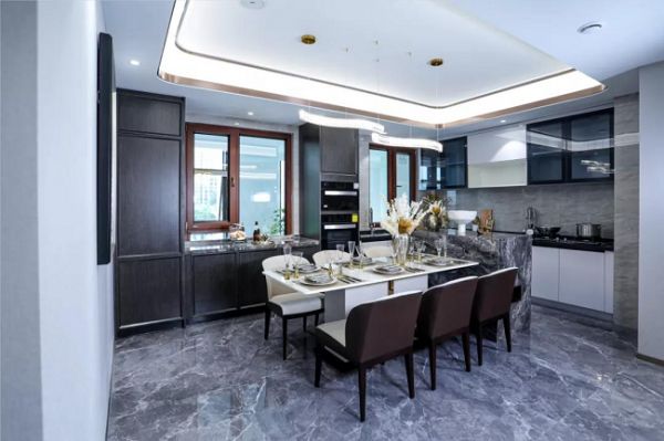 一体式餐厨设计,亦是“改善”的一大体现。全明U型厨房,空气对流通畅,美景时时相伴,尽享幸福烹饪时光。厨房与餐厅贯通,空间升级,可容纳6-8人同时用餐,一家人在这里享受美食,畅谈生活趣事,其乐融融。