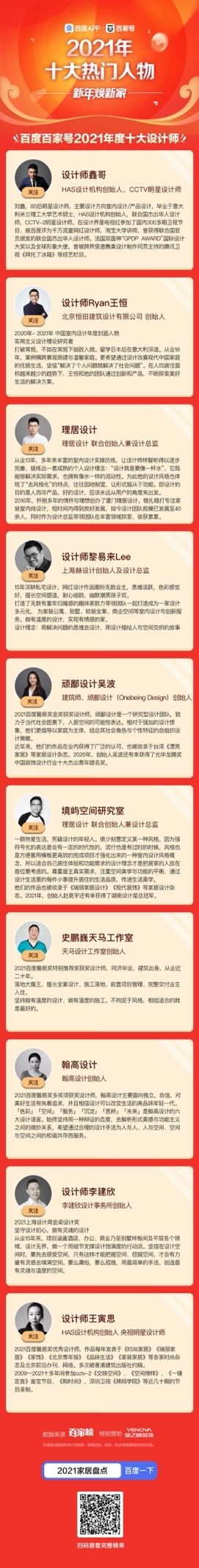 盘点百度平台家居行业年度影响力人物。从百家号内容量、阅读量、互动率、粉丝量等多个维度综合考量,选出年度十大家居创作者、十大设计师。他们是百家号内容的中坚力量。