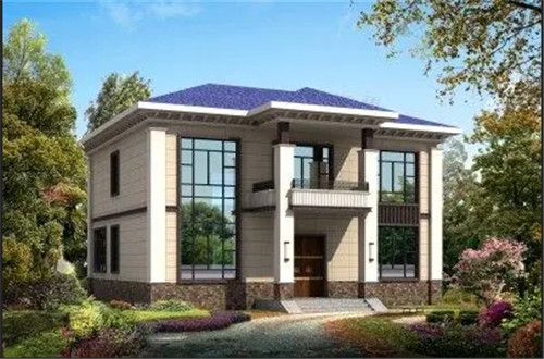 图纸介绍:这是一款新中式的设计图,外墙立面色彩搭配和谐统一,再配上蓝色的屋顶和两侧大大的落地窗,则可以让房屋既明亮简洁,又充满现代的时尚气息。而二楼的小阳台,可以供业主欣赏室外的美景。