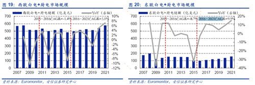 (图1:西欧&东欧白电+厨电市场规模及增速,欧睿国际、安信证券)