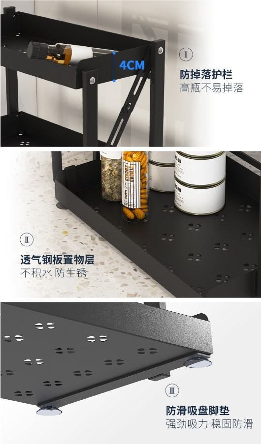 不仅如此,伟经免折叠调味料置物架还有一些看的见的贴心细节设计,置物架层有4厘米架高设计,这样即使是一些小的调料瓶也不用担心掉落啦。置物架的底端设置了4个防滑吸盘脚垫,在使用的过程中不用担心移位,也不用担心倒塌,让收纳更安心。