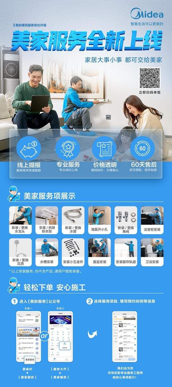 好在,已经有企业开始在服务上努力为生活家扫除后顾之忧。“美家服务”整合资源,提供了解决家庭基础安装、维修、拆除等各类难点问题的便民服务内容,涵盖13大类、63小项,更多便民服务内容在不断拓展,满足中国家庭的多样化家居需求。如今,“美家服务”不仅在北上广深四川地区开展服务,2022年1月15日开始,支持全国区域用户提报“美家服务”需求,实现全覆盖。“美家服务”全新升级,用户可在“美的服务”公众号独立报单家居服务需求,智能工单系统就会分配给有对应技能和工具的工程师来承接,方便又快捷,用行动传递热情与温暖。