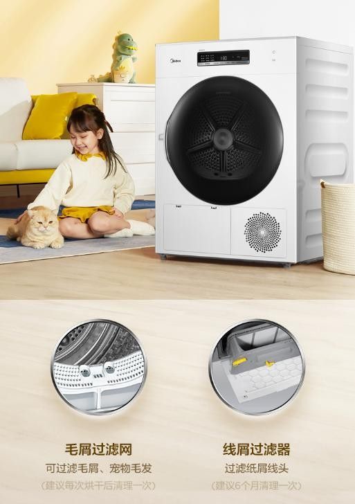 此外针对有宠家庭,美的干衣机还带来了双重毛屑过滤的贴心设计,干衣机筒内的毛屑过滤网能够有效过滤附着在衣物上的宠物毛屑,而底部的线屑过滤器则能够进一步过滤纸屑线头,双重保障让你和家里的萌宠更加亲密无忧。