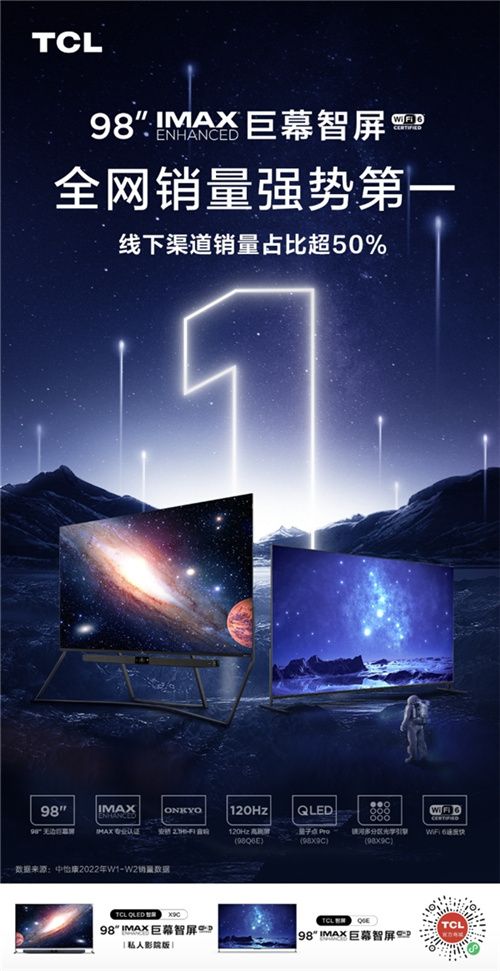 去年,TCL发布了98Q6E和98X9C两款98英寸巨幕智屏,凭借超高性价比和影院级别音画体验,在2021年取得了全年行业销量第一的成绩,并在今年W1-W2期间延续了去年的优异表现,以51.62%的线下销量占比和50.06%的线下销售额占比双双强势登顶榜首。
