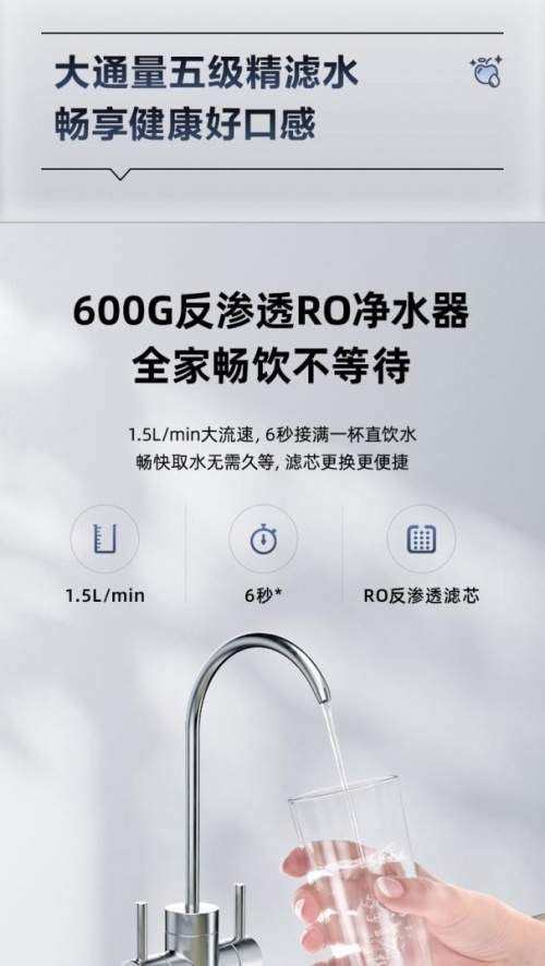 对于新一代的消费者来说,生活绝不能亏待自己,对品质的执着追求是他们的头等大事,而品质生活,最要紧的是健康。现在的水污染问题层出不穷,水烧开也未必能完全去除杂质,饮水机容易滋生微生物又占地,能够安心饮用和使用的健康净水就格外提升生活幸福感。