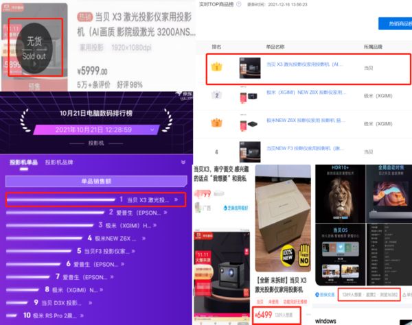 由于当贝X3以上拥有的高端配置、创新功能,以及符合大众消费的所带的超值体验。先后在618获得全网激光投影仪销售第一,2021年双十一投影仪机单品销售额预售登顶,双十一当天全网平台1分钟卖到无货;