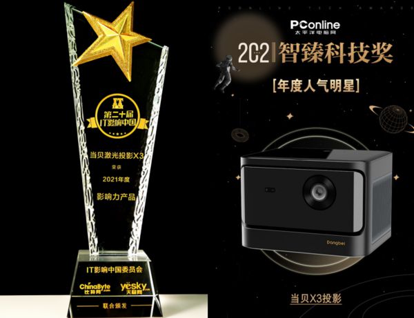 2022年当贝X3连续获得年度奖项,分获2021年度第二十届IT影响中国年度天极网2021年度影响力品牌,以及2021太平洋至臻科技奖年度人气明星,