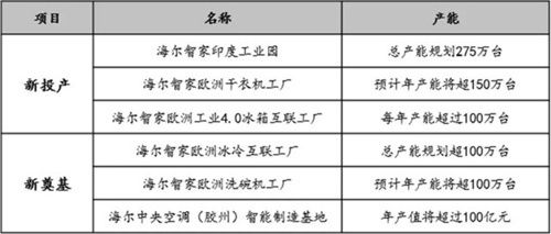 2021年,海尔智家在印度、欧洲新投产3个工厂,年产能超525万台,这些产能将在2022年进一步释放;2021年新奠基的3个工厂也将在2022年相继投产,预计投产后海外的2个工厂年产能将超200万台,国内的工厂年产值将超100亿元。