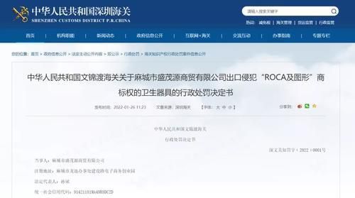 近日,深圳海关官网发布一份关于麻城市盛茂源商贸有限公司出口侵犯“ROCA及图形”商标权的卫生器具的行政处罚决定书。据决定书,2021年12月15日,麻城市盛茂源商贸有限公司委托深圳市正达报关有限公司以一般贸易方式向文锦渡海关申报出口货物一批,报关单号:532020210200236628。文锦渡海关经查验,发现该批出口货物中有未申报的标有“ROCA及图形”商标标识的马桶底座25个、水箱25个、马桶盖70个,价值人民币6000元。