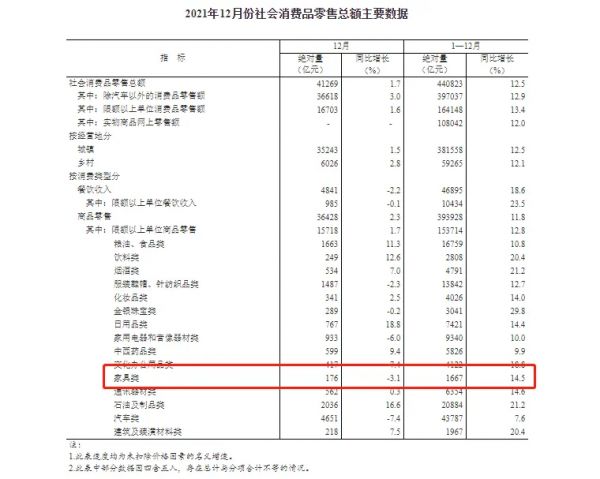 其中,家具类的消费品零售额1667亿元,同比增长14.5%。其中,2021年12月份,社会消费品零售总额41269亿元,同比增长1.7%。其中,家具类的消费品零售额176亿元,同比下降3.1%。