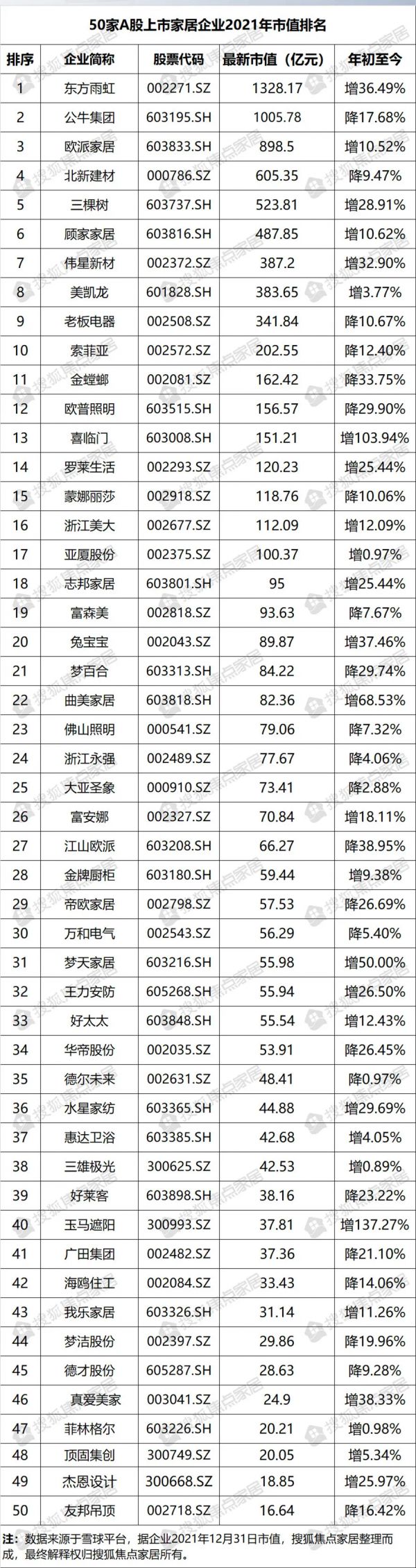 针对50家A股上市家居企业,据其2021年12月31日的市值表现,搜狐焦点家居特梳理出“50家A股上市家居企业2021年市值表现”排行榜。