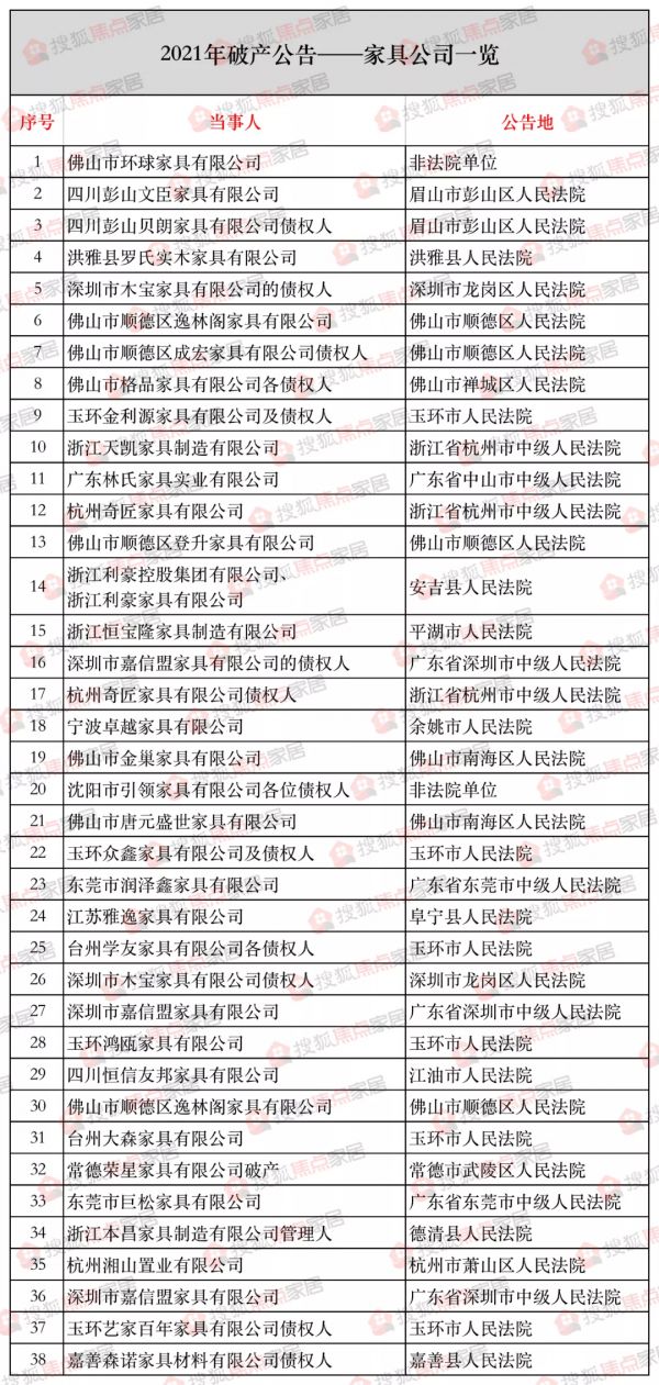 家具行业的市场集中度进一步提升,两极分化态势加剧,占据更大市场份额的规模型企业增多,地方性的中小型家具企业破产现象依旧。据人民法院公告网公开信息,搜狐焦点家居整理发现,2021年,有38家具备一定实力的家具企业破产,涉及木质家具、软体家具、床上用品、竹木制品等领域,比如利豪沙发、西奥多家居、贝朗家具、环球家具、金巢家具、卓越家具、海阔家具等。