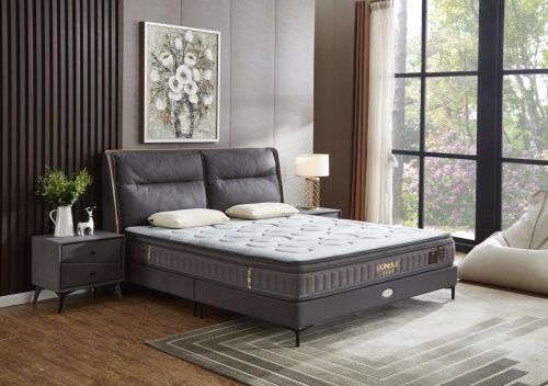东宝床垫DB-335是一款现代简约风格的皮床,采用齐边设计,更加节省卧室空间,方便上下床和更换床单,十分实用。它的床头靠包采用拉扣设计,造型十分圆润饱满,搭配高级灰显得时尚又优雅。
