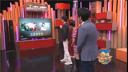 在节目现场中,毛晓彤想要和花样滑冰运动员张丹视频通话拜年,只见主持人说了句:”你好电视,打电话给张丹“,卡萨帝电视就立即接通了张丹的电话。电视画面同时显示出张丹、毛晓彤以及在场的主持人。
