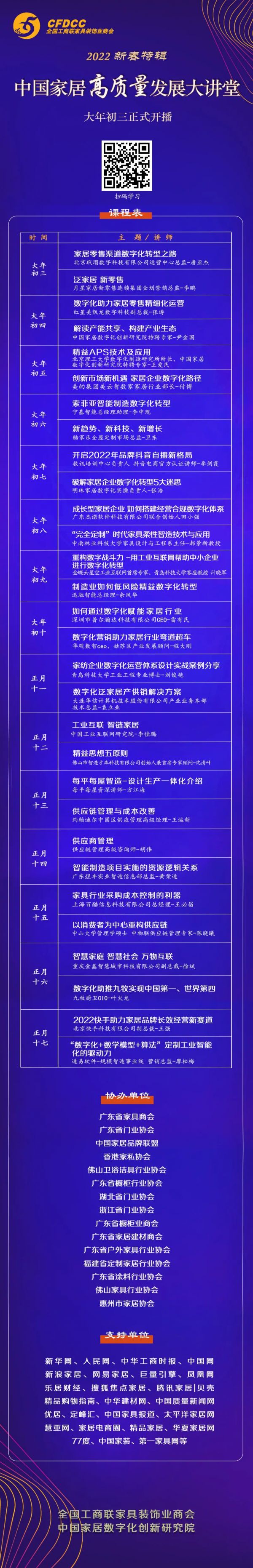 作为年度家居业高质量发展课堂的开年之作,本次课程特别邀请到了知名专家、行业实战专家、企业家们围绕数字化转型、精益管理、供应链创新应用等内容开展,全部内容在小鹅通播出,课程为录播形式,每节课25至30分钟。