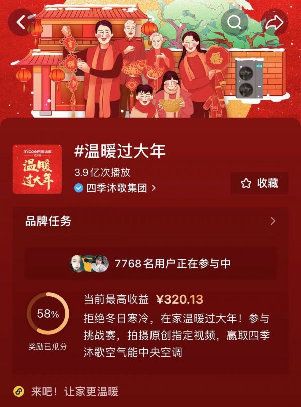 远隔千里,共叙暖意。凭借简单的参与方式、有趣的画面设计与暖心又暖身的奖项设置,四季沐歌#温暖过大年#抖音区域挑战赛自1月25日上线后一直保持着相当高的热度,尤其是春节期间,众多抖音达人纷纷种草,广大参与者的热情更是掀起了一波新的高潮。纵观参加挑战赛的众多作品,无论是画面还是文字,或清新隽永,或热烈喜庆,或幽默风趣,除了表达对于新年新气象以及家人团聚的热望之外,更多的则是对挑战赛、对四季沐歌空气能所体现融融暖意的附和与赞许。