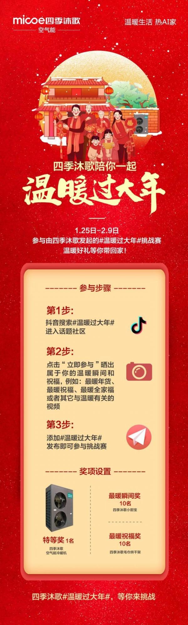 喜迎新年,暖字当先。在辞旧迎新的隆冬时节,一切自然都要围绕着一个“暖”字展开才应节应景,#温暖过大年#顾名思义更是如此,不仅参与方式紧扣“暖”字,奖项设置更是与“暖”字息息相关。在1月27日-2月9日活动期间,所有参与者都将有机会获得不同奖项,最暖瞬间奖10名,各奖励四季沐歌小厨宝一台;最暖祝福奖10名,各奖励四季沐歌毛巾烘干架一台;而作为令人瞩目的特等奖得主,则将获得四季沐歌空气能冷暖机一台。年味随暖心而升温,新春礼赠种种福利,自上线以来,#温暖过大年#抖音区域挑战赛引得众多抖音达人纷纷种草,广大参与者的热情更是掀起了一波新的高潮。