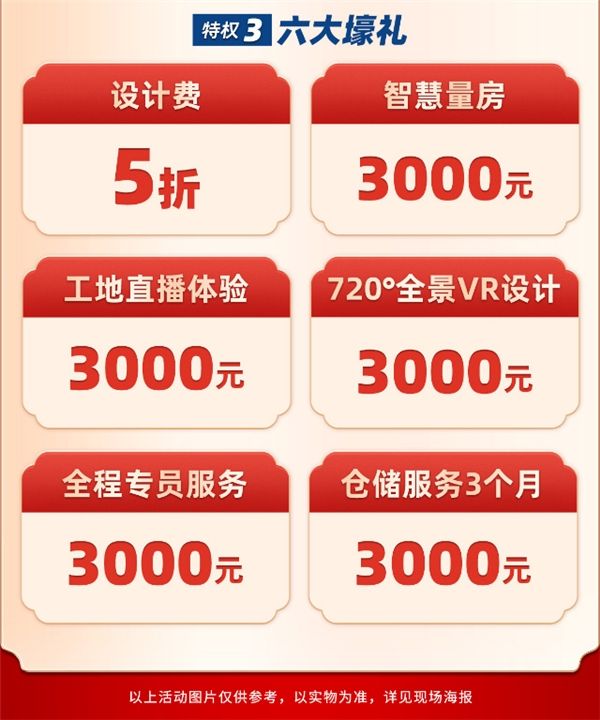 此外,“新春家装钜惠”活动的第三项特权,便是“六大壕礼”活动,该活动则规定:客户可以享受5折设计费,3000元工地直播体验,3000元智慧量房服务,3000元全程专员服务,3000元仓储服务3个月,以及3000元720度全景VR设计等服务,打造高度定制化的家居环境,为生活增添更多的亮丽色彩。