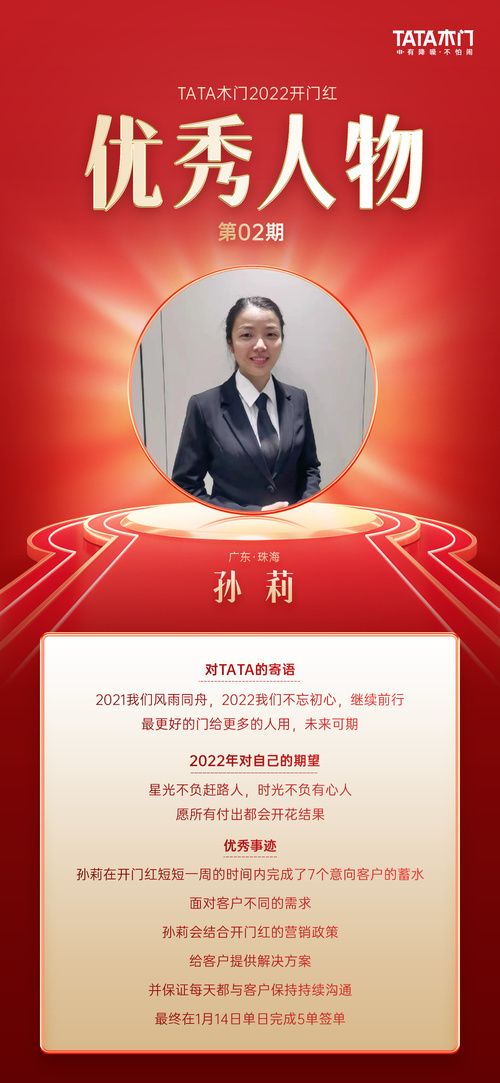 人物:孙莉,2018年入职TATA木门,主要负责门店销售工作。一周时间蓄水意向客户7户,结合总部开门红政策每天和顾客保持互动,针对客户需求进行线上微信签单。