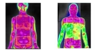 左边为健康状态的人体体表温度分布,右边为疾病状态的人体体表温度分布示意图
