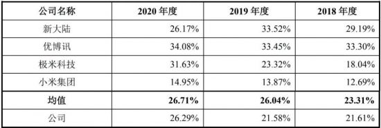 虽然在招股书中,商米科技选取了新大陆、优博讯(300531)、极米科技、小米集团作为同行业可比公司,并且公司2020年的毛利率26.29%与行业平均值26.71%相近,但上交所在问询函中,却对此发出了质疑。
