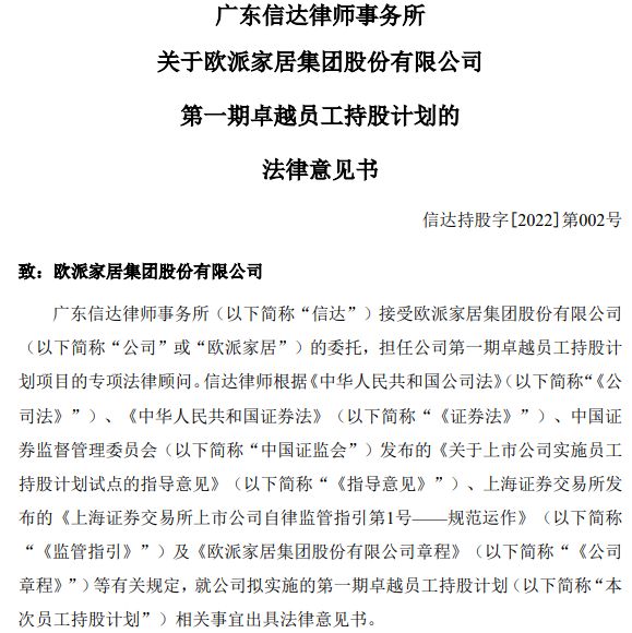 定制快讯|广东信达律师事务所发布关于欧派家居第一期卓越员工持股计划的法律意见书