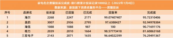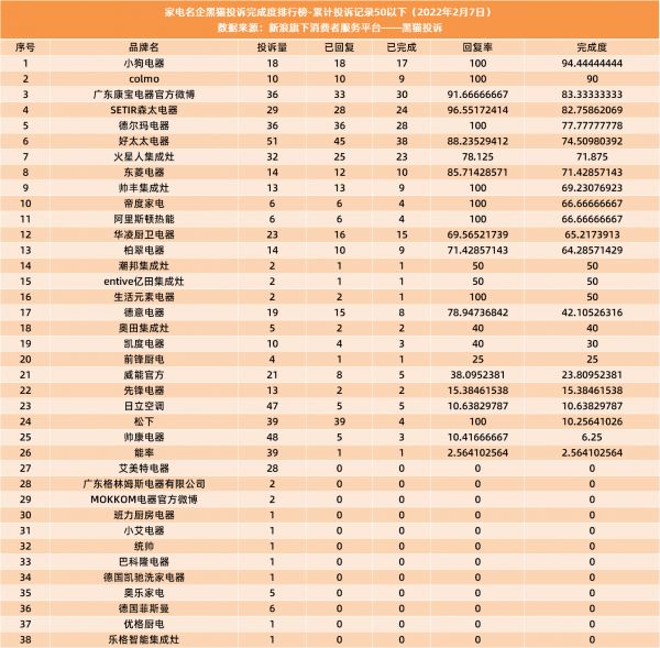 为了帮助广大消费者更及时直观了解到家电品类商家服务质量,2022年1月1日起,新浪家居家电事业部将每周根据最新数据汇总统计家电名企黑猫投诉完成度排行榜。榜单完全依据黑猫投诉平台现有最新累计投诉及回复率、完成度情况统计而出,希望借此显扬急速响应、急速反馈、妥善解决消费问题的企业,也借此警醒面对消费投诉不作为或懒作为的企业。