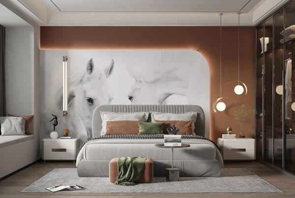 或如驰骋的骏马,整体色调以白色为主,画面中两匹白色的骏马,象征纯洁和高贵,骏马有乘风破浪,纵横驰骋的美好寓意,巧妙的明暗色彩运用赋予空间超凡脱俗的艺术格调。