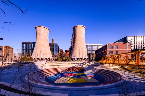厂东门广场作为首钢园北区中央绿轴的起点,不仅是吸引人们体验工业遗址公园的景观,更是成为了凝聚首钢人深厚情感的心理地标。基于通过光线融合环境的想法,灯光与工业文化相互融合,营造一光一方天的氛围。