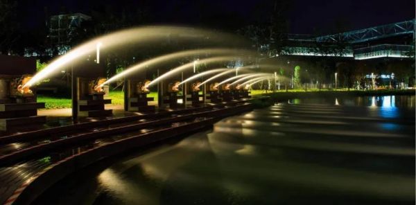 夜幕降临,华灯初上。在灯光辉映下,这座高大恢弘的工业建筑,经过改造建设后正以崭新的面貌,焕发出时代与青春的气息。本次改造中,主要打造了秀池九龙头、栈道、过道、亭子等在内的景观,华艺为这个绝美的景观植入了光的生命。