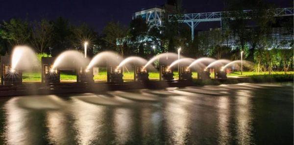“九龙头”是秀池景观提升的重点。华艺结合实地测试情况,对“九龙头”的配灯方案作了深入探究,15°的光束角、升级的芯片既实现了龙头“喷水”时,水、光同步,又保证了光质的均匀和其密封防水的性能。灯光下的“九龙头”古朴典雅、庄重大气、栩栩如生,让原本静寂的工业建筑,焕发生机。