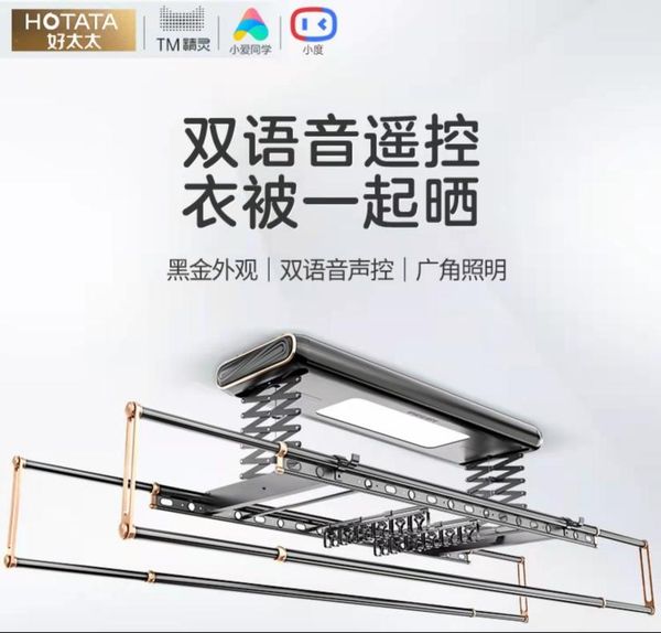 智能晾衣机是一种使用电作为驱动力、向智能化方向发展的家居产品,主要由电机驱动的动力系统、智能控制系统和合金制造的机身系统等模块组成,根据用户的多样化需求,集成了包括照明、声控、远程控制、烘干、风干和消毒等功能。比如行业top1好太太的热销款D-3131智能晾衣架,操作简单,可通过双语音遥控,亦可用APP控制。不仅如此,它还具备了烘干、消毒、除螨等所有功能,全能满足日常晾衣需求。