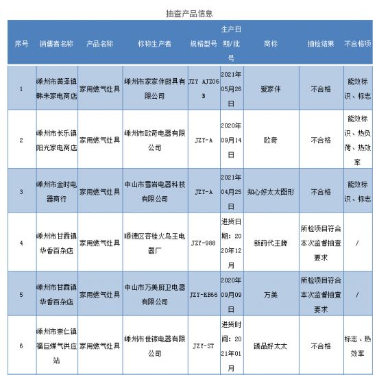 近日,浙江省嵊州市市场监管局通报2021年下半年嵊州市流通领域产品质量监督抽查结果。本次抽查家用燃气灶具产品10批次,不合格8批次。