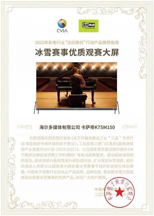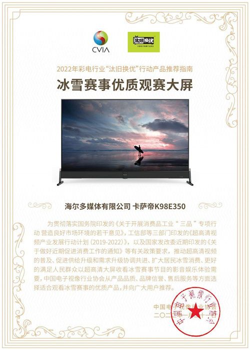 为此,中国电子视像行业协会发布《2022年彩电行业“汰旧换优”行动产品推荐指南》,对电视清晰度、响应速度等各项指标提出严格要求。卡萨帝电视两款产品,被推荐为冰雪赛事优质观赛大屏。