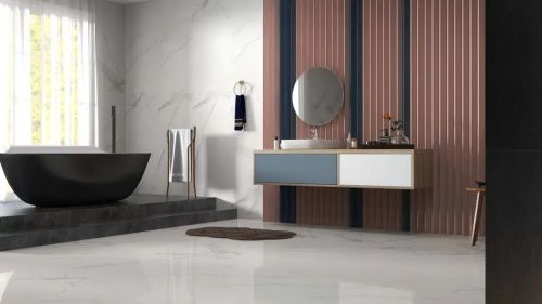 博德旗下有着多款白色系瓷砖,比如鱼肚白系列,洁白的底色,错落有致的大理石纹理,搭配时尚挂画点缀,让白色空间更显时尚和温度;冰川白系列的白色搭配金色,能够很好地和暖色调融合,为卫浴间带来几分柔和感。