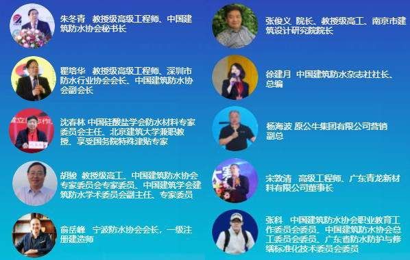 行业大咖朱冬青、瞿培华、沈春林、胡骏、俞岳峰、张俊义、宋敦清、张科等专家学者,以及在防水补漏行业取得巨大成就的老板,将为大家进行宣讲,为大家分享行业大势与国家补漏标准的实施,以及个人经验总结,财富密码,有助你快速融入行业精英朋友圈,掌握当前的最新防水补漏资讯和行业走势,把握投资方向,降低投资风险,将事业更快更稳走向新的辉煌。