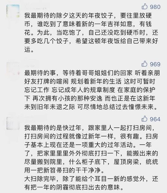纵观简一「奔赴美好家」的一系列操作,其中最让人印象深刻的,是在其在社交平台上推出的话题互动#过年在家最期待的时刻。翻阅网友的回复发现,在他们的故事里有关童年、有关成长、有关离别、有关改变...字里行间轻轻地拨动了人们那个敏感的神经。