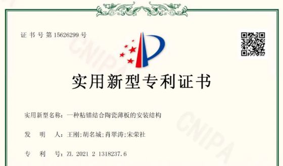 陶卫快讯|美好超薄岩板新型粘锚技术获得国家实用型专利证书