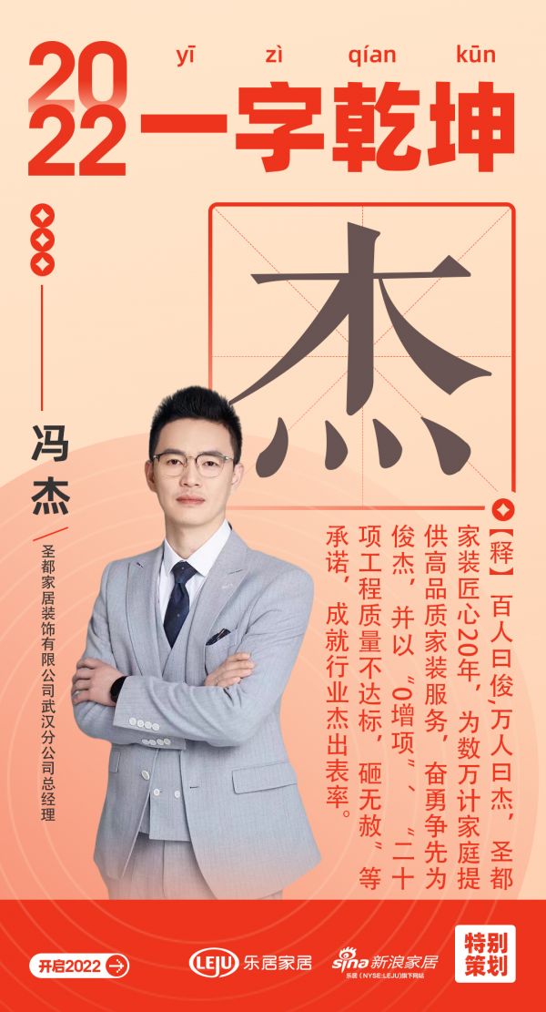 “乐业安居”是中国人最为共情之处,湖北家居人深谙汉字对于国人、对于企业的非凡意义,武汉新浪家居战略合作伙伴、家居行业优秀代表:圣都家居装饰有限公司武汉分公司总经理冯杰,以「杰」字打开新年仪式感。