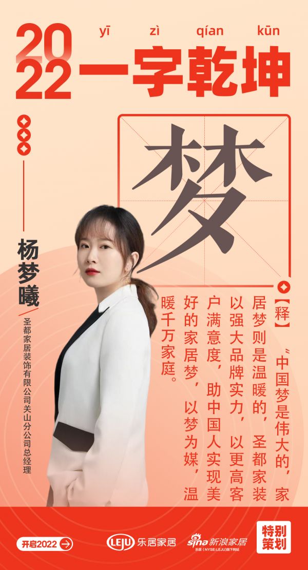 “乐业安居”是中国人最为共情之处,湖北家居人深谙汉字对于国人、对于企业的非凡意义,武汉新浪家居战略合作伙伴、家居行业优秀代表:圣都家居装饰有限公司关山分公司总经理杨梦曦,以「梦」字打开新年仪式感。