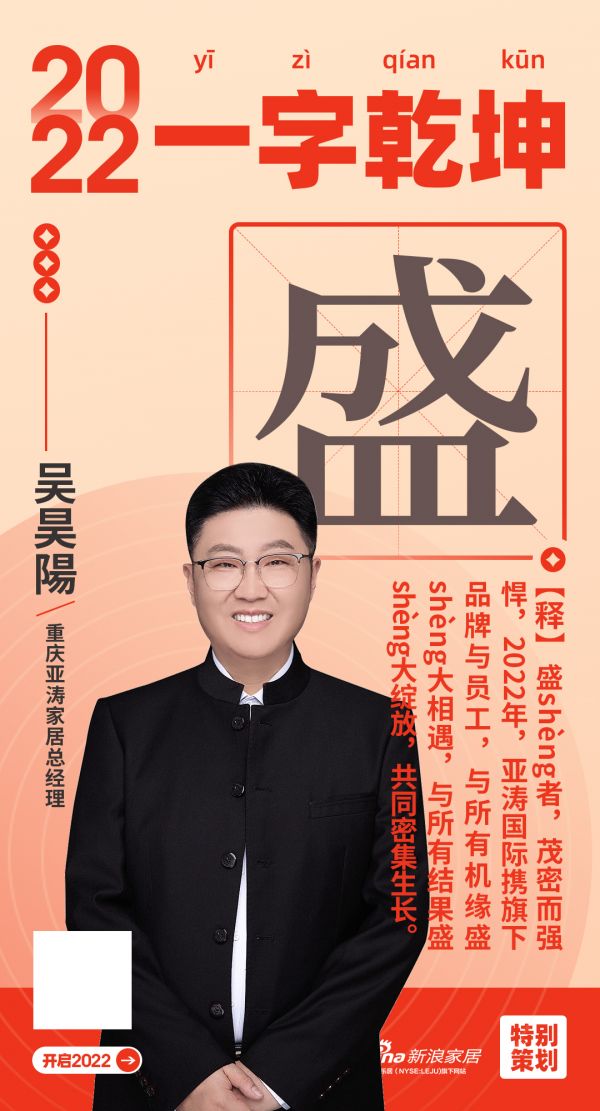 在“2022一字乾坤”活动中,新浪家居贵州站站长张建刚用「盛」表达了2022年的规划和目标:盛者,茂密而强悍,2022年,亚涛国际携旗下品牌与员工,与所有机缘盛大相遇,与所有结果盛大绽放,共同密集生长。