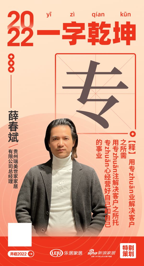 在“2022一字乾坤”活动中,贵州瑞美世家家居有限公司总经理薛春斌用「专」表达了2022年的规划和目标:
