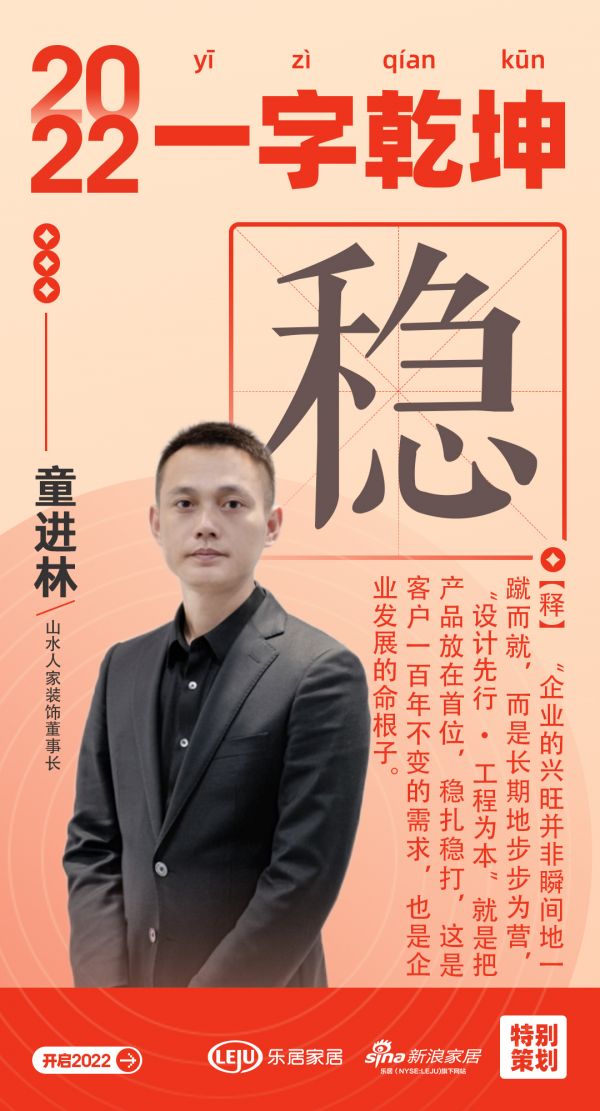“乐业安居”是中国人最为共情之处,湖北家居人深谙汉字对于国人、对于企业的非凡意义,武汉新浪家居战略合作伙伴、家居行业优秀代表:山水人家装饰董事长童进林,以「稳」字打开新年仪式感。