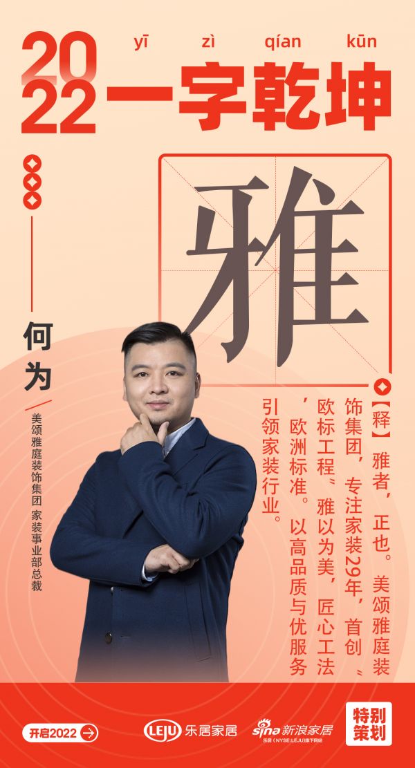 “乐业安居”是中国人最为共情之处,湖北家居人深谙汉字对于国人、对于企业的非凡意义,武汉新浪家居战略合作伙伴、家居行业优秀代表:美颂雅庭装饰集团执行总裁何为,以「雅」字打开新年仪式感。