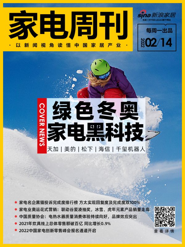 家电名企黑猫投诉完成度排行榜出炉;被冰墩墩可爱到的绿色冬奥,还有这些不得不知的家电圈粉黑科技;家电企业奥运花式营销:联动谷爱凌抽奖,冰雪、虎年元素产品销量走高;首批通过新版国家标准净水机产品发布;虎年春节消费洞察:智能 健康 换新成为关键词……一周精彩新闻全在新浪家居家电周刊,不容错过。
