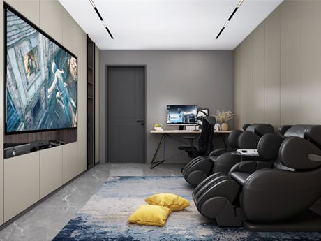 曼居的设计对标现代年轻家庭的生活需求。从审美层面来说,曼居传递的是一种人生漫漫,要乐在其中的生活理念,整体设计简素而大气;从功能空间来说,更加注重对生活的享受,生活悦慢,身体悦轻,人生也就越快乐。而曼居影音空间的设计则成功打动年轻消费群体。影音空间毫无疑问的是一个极为私密的小型家庭影院,封闭的空间让光影的魅力发挥到极致,选一部两人都爱的电影,两张家用按摩椅让你的情人节约会更加与众不同。私人影院的另一个好处就是无人打扰,依托墙体设计的酒柜在磨砂玻璃的笼罩下显得格外诱人,情到浓时开一瓶酒,相视一眼的干杯是两人日积月累的默契,爱的表达方式又岂有语言一种呢?如果安静的观影不适合你,这里也是电竞爱好者的游戏空间,隔音幕墙打消扰邻的顾虑,让你能够尽情放肆,酒柜旁边的咖啡吧零食台,随时随地补充能量。为了提高空间利用率,曼居影音空间还是一个电脑房,偶尔的居家办公,或者休闲学习在这里都不被打扰。生活有了仪式感,有爱,每天都是情人节!
