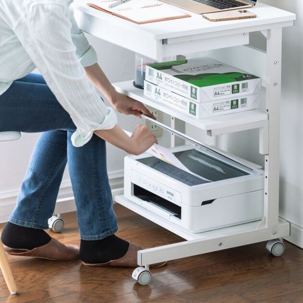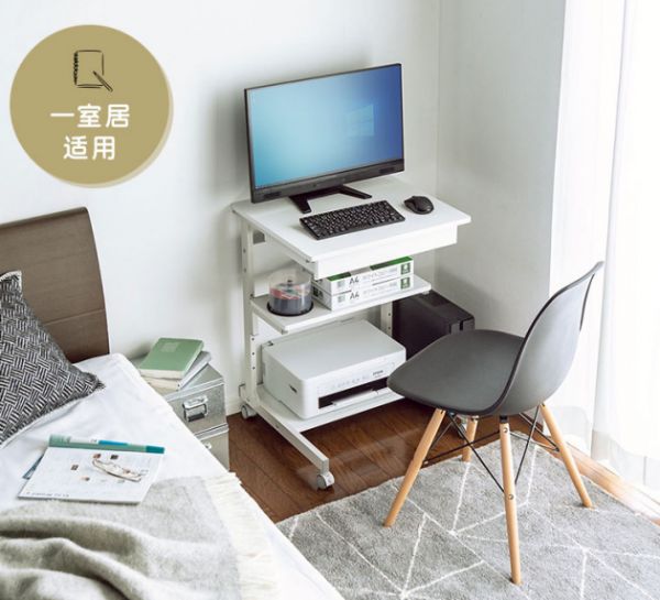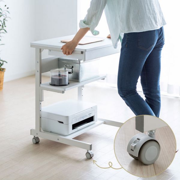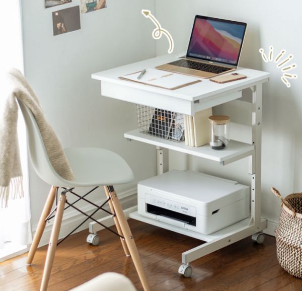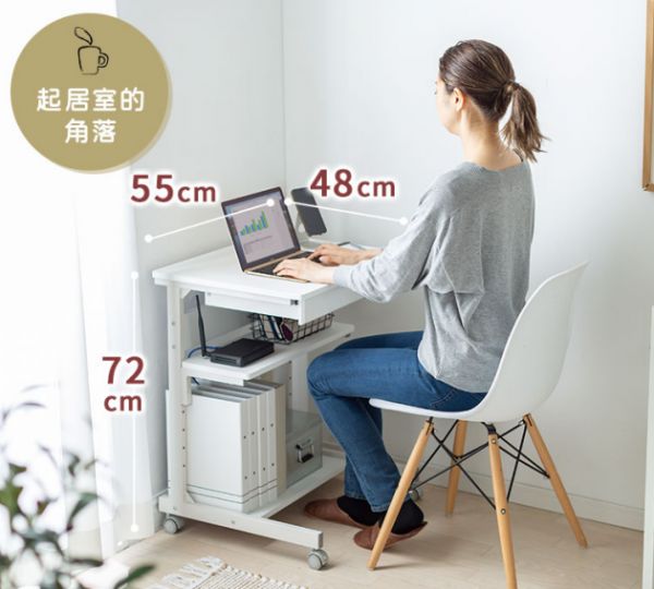 一张移动桌小小身材却不简单,具备多功能花样活力,55cm×48cm的精巧桌面、方便收纳小物的抽屉、5段高度可调的开放式置物架,附带橡胶制滚轮可以行云流水般快速移动哦。